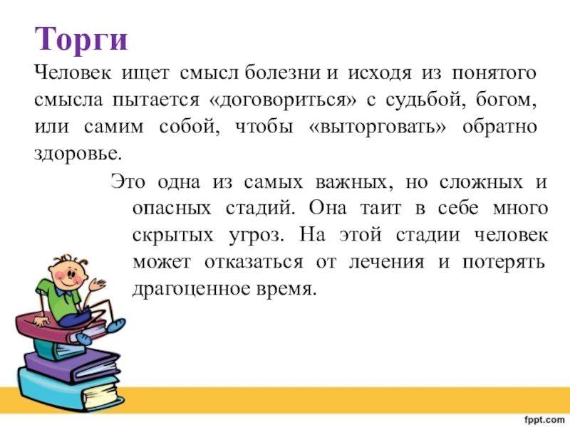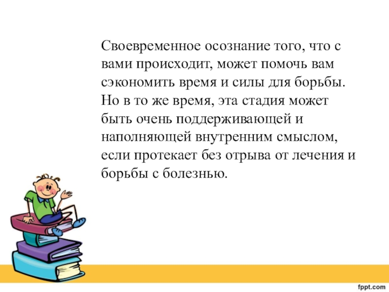 время и силы для борьбы. Но в то же время, эта стадия может быть очень поддерживающей и наполняющей внутренним смыслом, если протекает без отрыва от лечения и борьбы с болезнью.