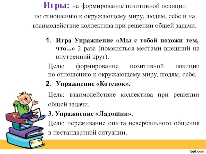 Игры: на формирование позитивной позиции по отношению к окружающему миру, людям, себе и