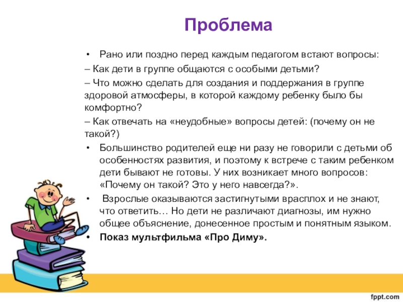 Большинство родителей еще ни разу не говорили с детьми об особенностях развития, и поэтому к встрече с таким ребенком дети бывают не готовы. У них возникает много вопросов: «Почему он такой? Это у него навсегда?».