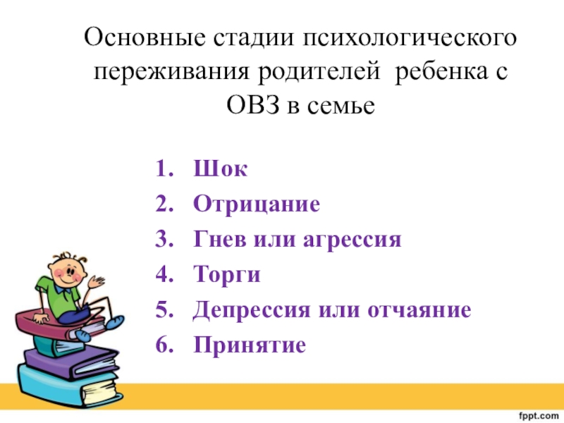 Слайд 7Основные стадии психологического переживания родителей ребенка с ОВЗ в семье