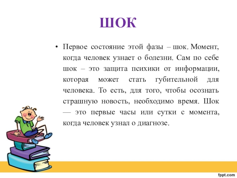 по себе шок – это защита психики от информации, которая может стать губительной для человека. То есть, для того, чтобы осознать страшную новость, необходимо время. Шок — это первые часы или сутки с момента, когда человек узнал о диагнозе.