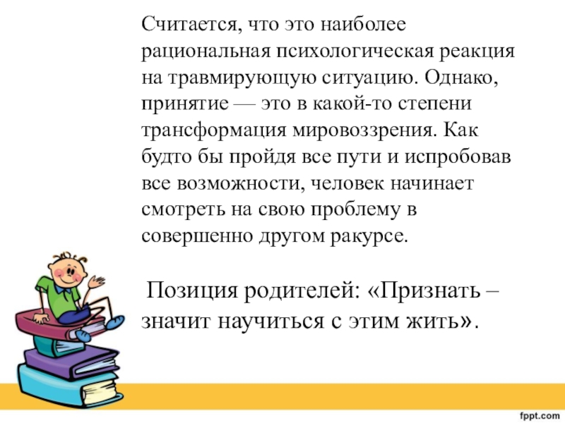 Слайд 16Считается, что это наиболее рациональная психологическая реакция на травмирующую ситуацию. Однако,