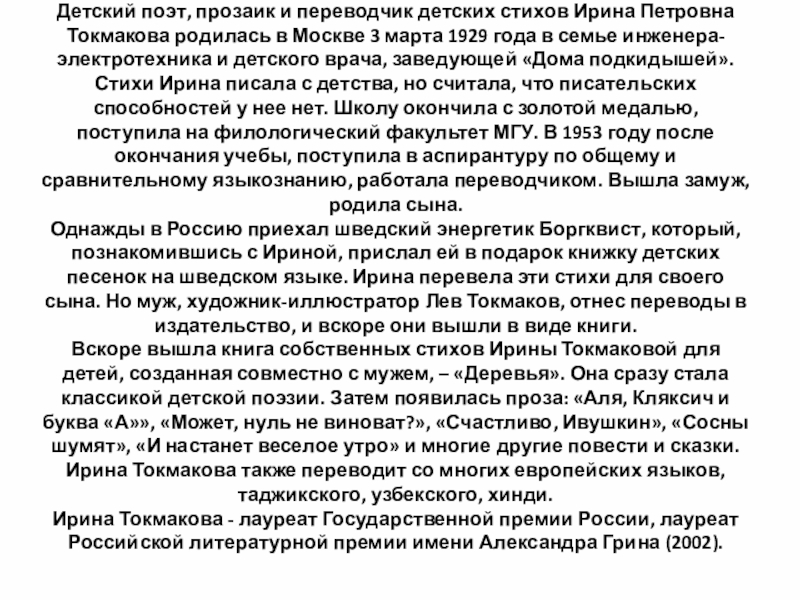 Слайд 11Детский поэт, прозаик и переводчик детских стихов Ирина Петровна Токмакова родилась