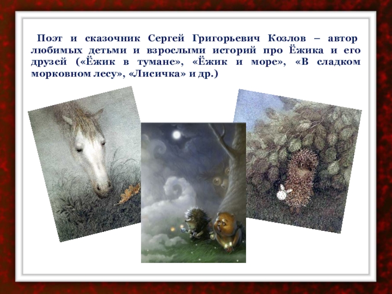 автор любимых детьми и взрослыми историй про Ёжика и его друзей («Ёжик в тумане», «Ёжик и море», «В сладком морковном лесу», «Лисичка» и др.)