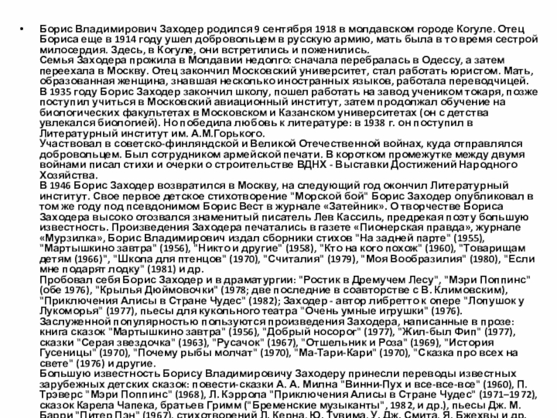 Слайд 3Борис Владимирович Заходер родился 9 сентября 1918 в молдавском городе Когуле.