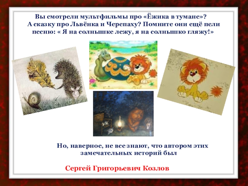 А сказку про Львёнка и Черепаху? Помните они ещё пели песню: « Я на солнышке лежу, я на солнышко гляжу!»