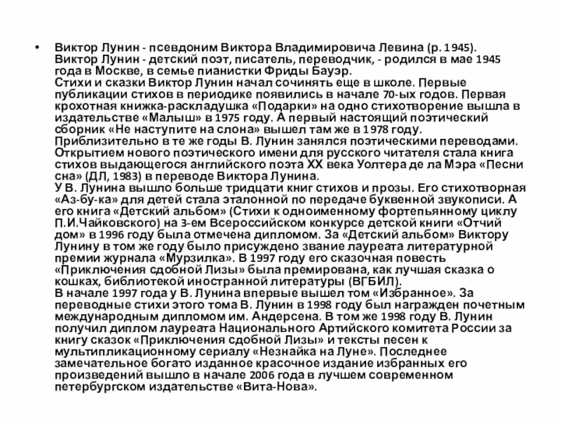 Слайд 9Виктор Лунин - псевдоним Виктора Владимировича Левина (р. 1945).