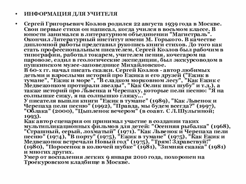 Поэт и сказочник Сергей Григорьевич Козлов –