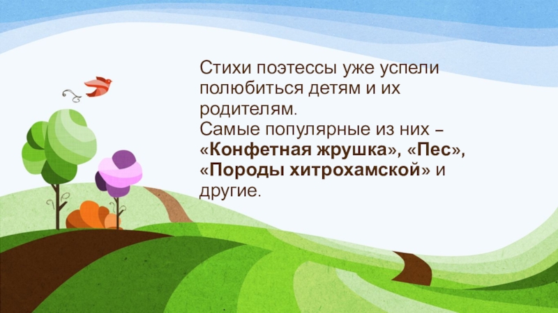 Слайд 18Стихи поэтессы уже успели полюбиться детям и их родителям. Самые популярные из