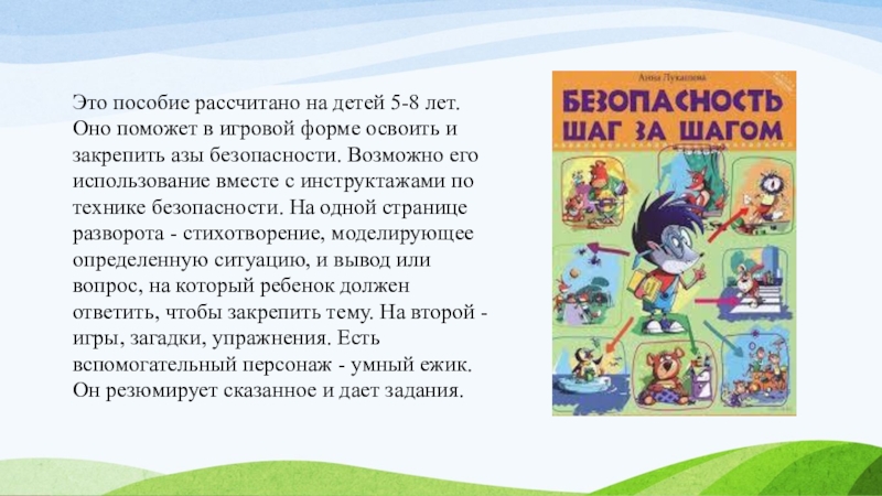 форме освоить и закрепить азы безопасности. Возможно его использование вместе с инструктажами по технике безопасности. На одной странице разворота - стихотворение, моделирующее определенную ситуацию, и вывод или вопрос, на который ребенок должен ответить, чтобы закрепить тему. На второй - игры, загадки, упражнения. Есть вспомогательный персонаж - умный ежик. Он резюмирует сказанное и дает задания.