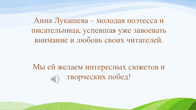 Слайд 19Анна Лукашева – молодая поэтесса и писательница, успевшая уже завоевать внимание