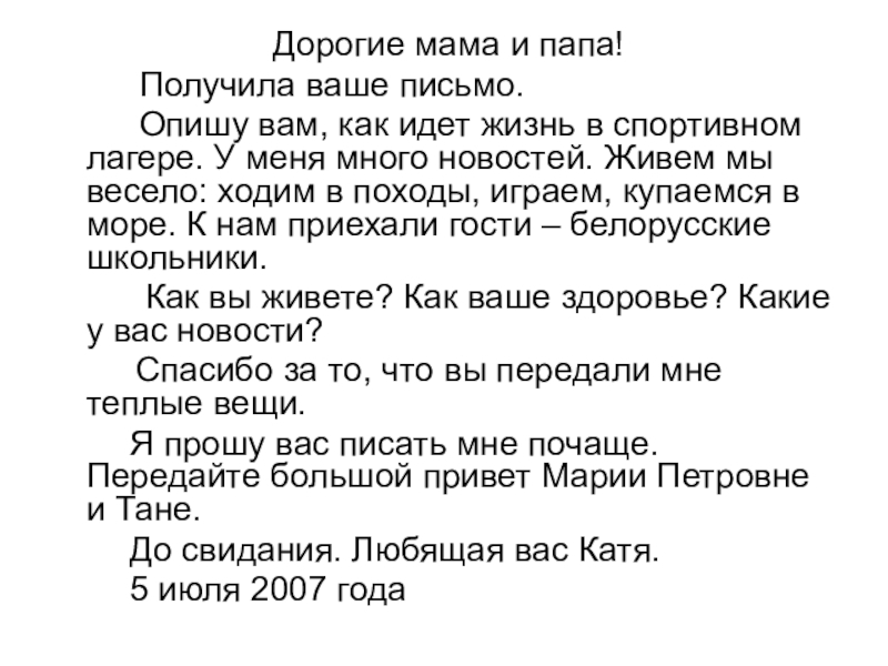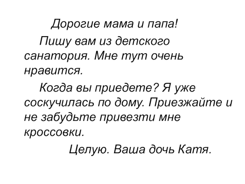 Дорогие мама и папа!		Пишу вам из детского санатория. Мне тут очень нравится. 		Когда вы приедете? Я уже