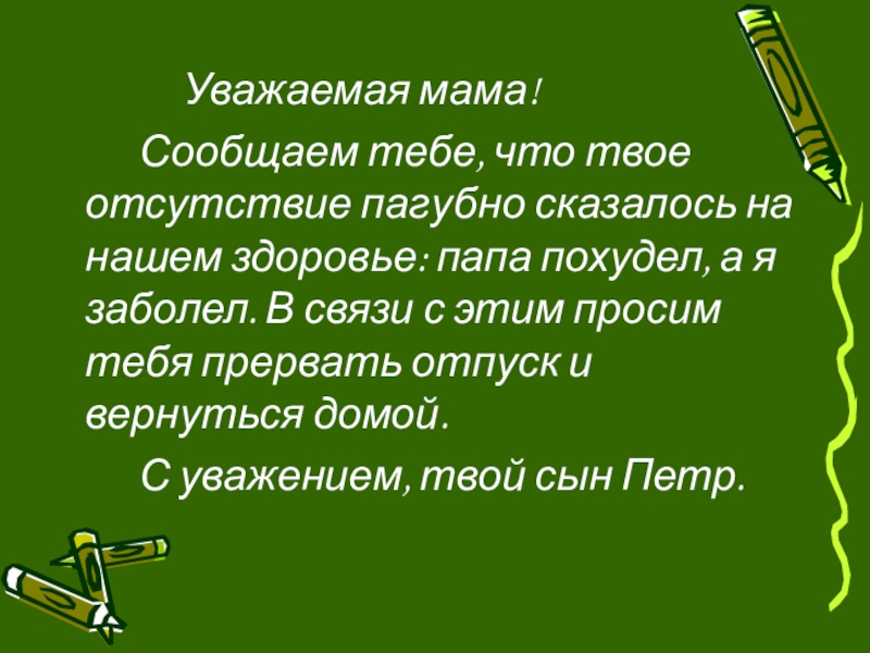Уважаемая мама!		Сообщаем тебе, что твое отсутствие пагубно сказалось на нашем здоровье: папа похудел, а я заболел. В