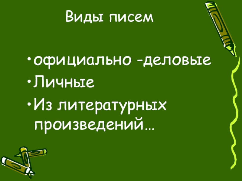 Виды писемофициально -деловые ЛичныеИз литературных произведений…