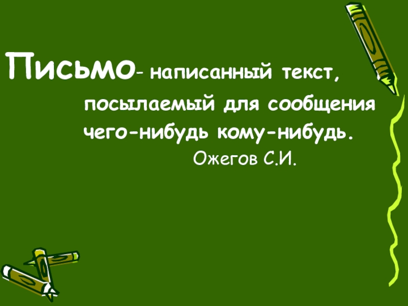 Письмо- написанный текст,     посылаемый для сообщения     чего-нибудь кому-нибудь.