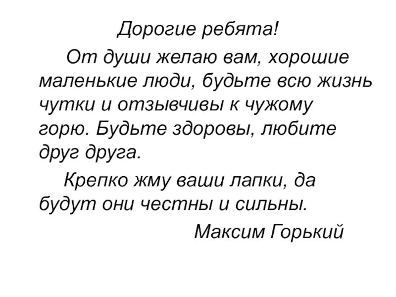 Дорогие ребята!	  От души желаю вам, хорошие маленькие люди, будьте всю жизнь чутки и отзывчивы к