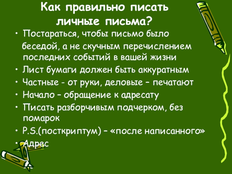 Как правильно писать  личные письма?Постараться, чтобы письмо было  беседой, а не скучным перечислением последних событий