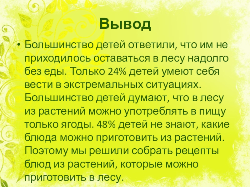 без еды. Только 24% детей умеют себя вести в экстремальных ситуациях. Большинство детей думают, что в лесу из растений можно употреблять в пищу только ягоды. 48% детей не знают, какие блюда можно приготовить из растений. Поэтому мы решили собрать рецепты блюд из растений, которые можно приготовить в лесу.