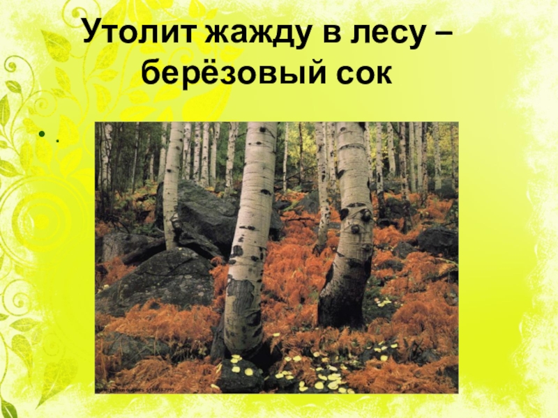 Слайд 11Утолит жажду в лесу – берёзовый сок