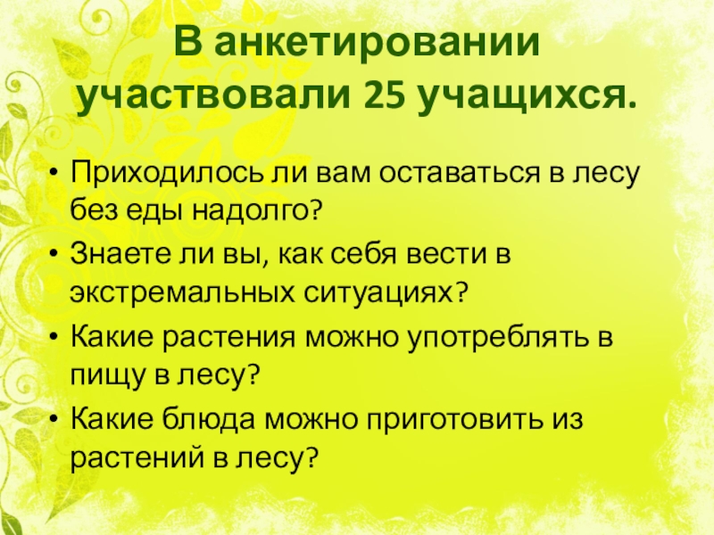 Слайд 5В анкетировании участвовали 25 учащихся.