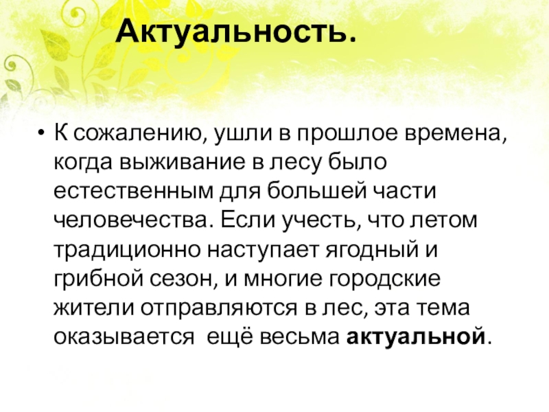 естественным для большей части человечества. Если учесть, что летом традиционно наступает ягодный и грибной сезон, и многие городские жители отправляются в лес, эта тема оказывается ещё весьма актуальной.