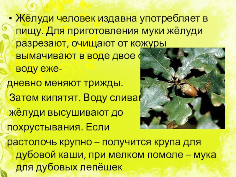 Жёлуди человек издавна употребляет в пищу. Для приготовления муки жёлуди разрезают,