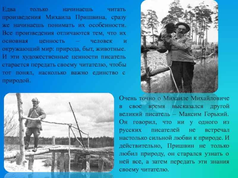 Едва только начинаешь читать произведения Михаила Пришвина, сразу же начинаешь понимать их особенности. Все произведения отличаются тем, что их основная ценность – человек и окружающий мир: природа, быт, животные. И эти художественные ценности писатель старается передать своему читателю, чтобы тот понял, насколько важно единство с природой.