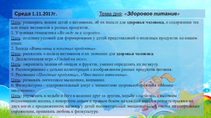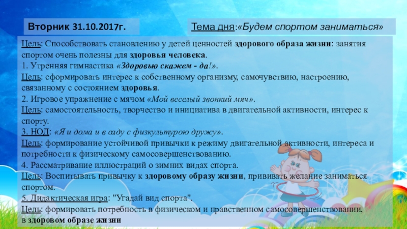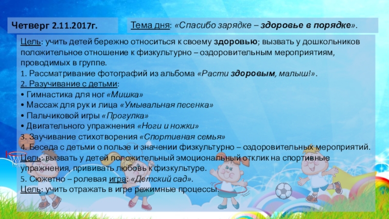 Цель: Способствовать становлению у детей ценностей здорового образа