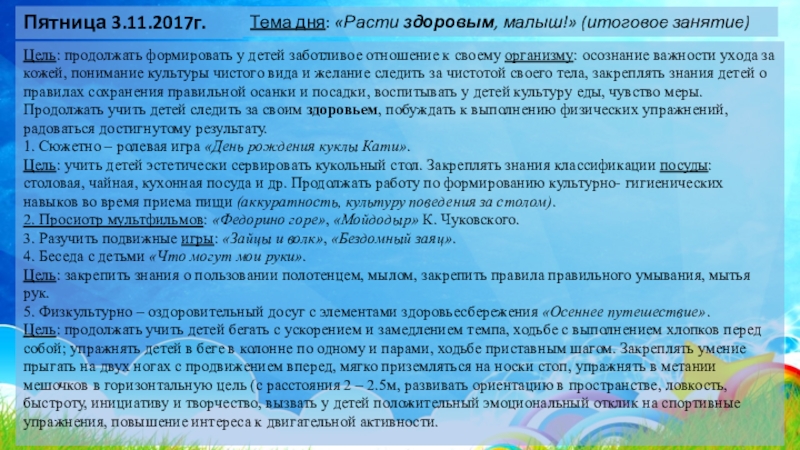 Тема дня: «Расти здоровым, малыш!» (итоговое занятие)