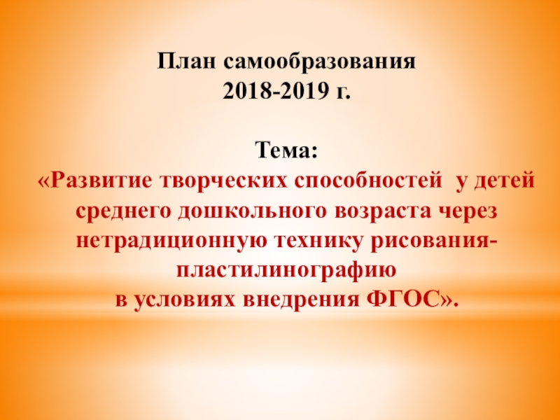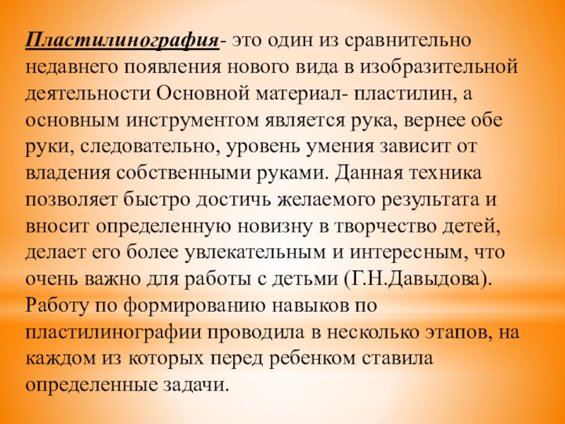деятельности Основной материал- пластилин, а основным инструментом является рука, вернее обе руки, следовательно, уровень умения зависит от владения собственными руками. Данная техника позволяет быстро достичь желаемого результата и вносит определенную новизну в творчество детей, делает его более увлекательным и интересным, что очень важно для работы с детьми (Г.Н.Давыдова).