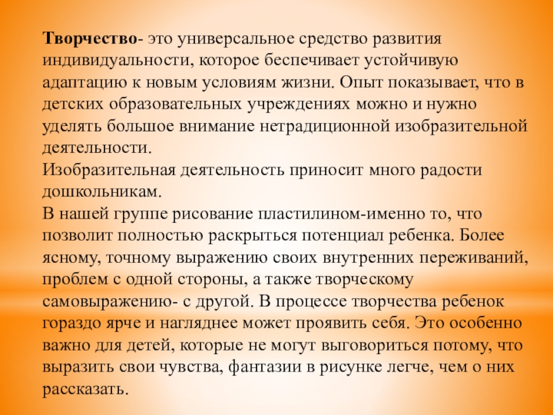 Слайд 6Творчество- это универсальное средство развития индивидуальности, которое беспечивает устойчивую адаптацию к