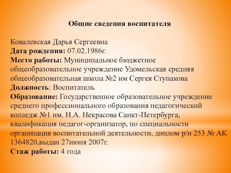 Образование: Государственное образовательное учреждение среднего профессионального образования педагогический колледж №1 им. Н.А. Некрасова Санкт-Петербурга, квалификация педагог-организатор, по специальности организация воспитательной деятельности, диплом р/н 253 № АК 1364820,выдан 27июня 2007г.