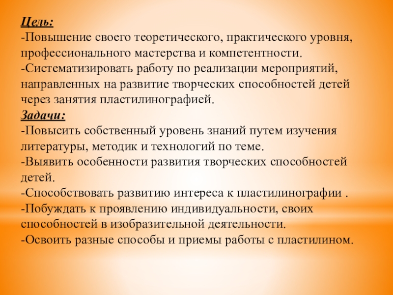 Научиться не выходить за контур рисунка, размазывать пластилин по всему рисунку, использовать несколько цветов, вспомогательных предметов для придания выразительности работам.