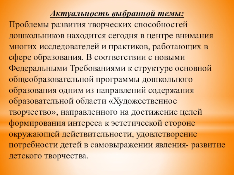 Проблемы развития творческих способностей дошкольников находится сегодня в центре