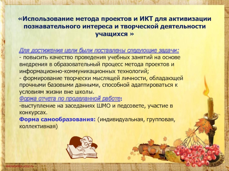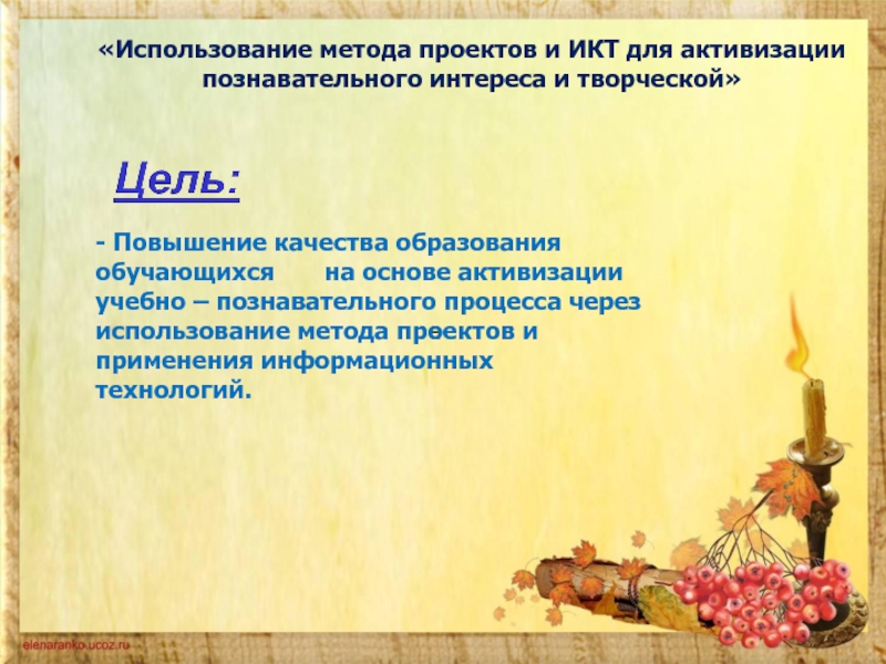- Повышение качества образования обучающихся на основе активизации учебно – познавательного процесса через использование метода проектов и применения информационных технологий.