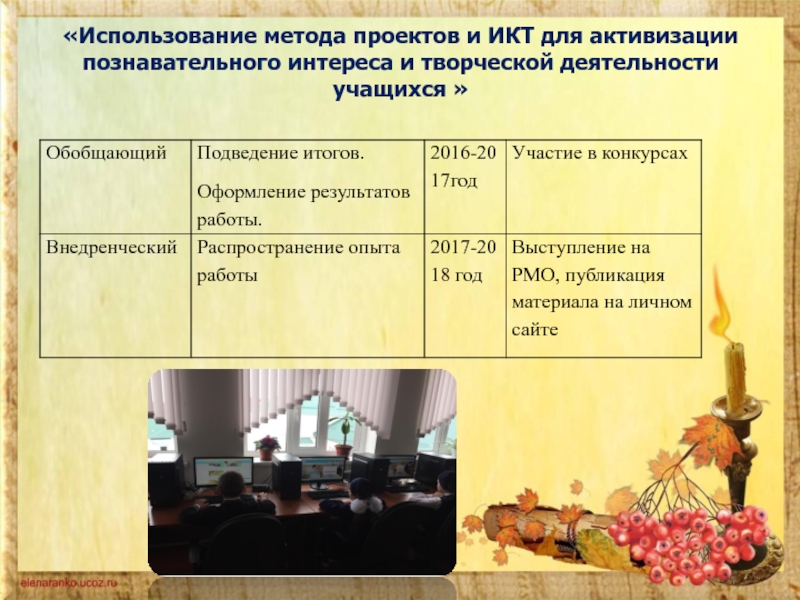 - повысить качество проведения учебных занятий на основе внедрения в образовательный процесс метода проектов и информационно-коммуникационных технологий;