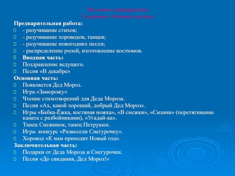 Муз. досуг «Зимняя сказка» (показ детям младшей группы новогодней сказки).