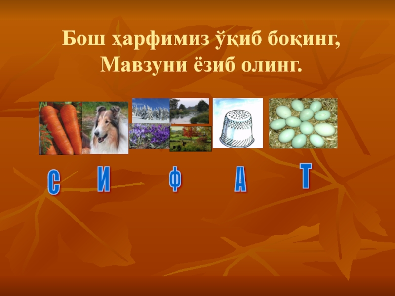 Слайд 37Бўлар сариқ ё қизил, Ер тагида етилар. Тупида якка ҳосил, Сочи яшил селкиллар.