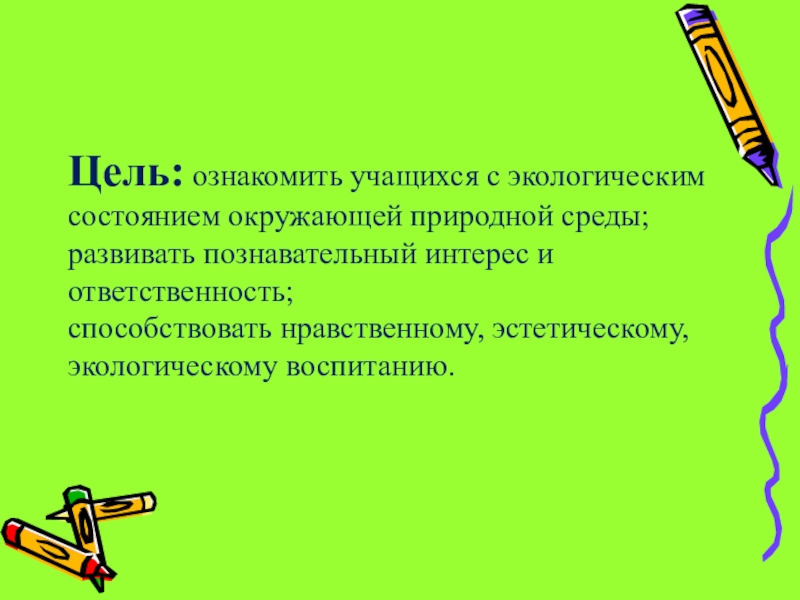 Слайд 2Цель: ознакомить учащихся с экологическим состоянием окружающей природной среды;