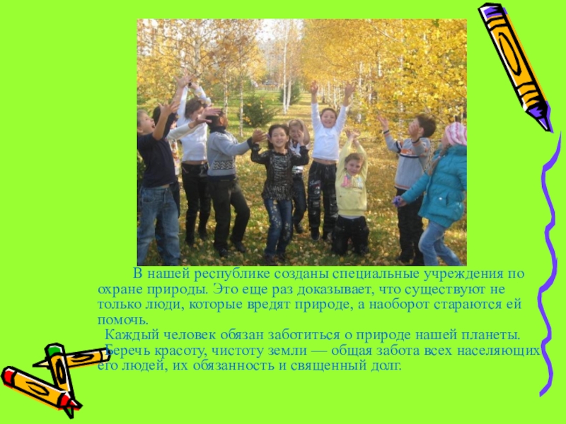 Беречь красоту, чистоту земли — общая забота всех населяющих его людей, их обязанность и священный долг.