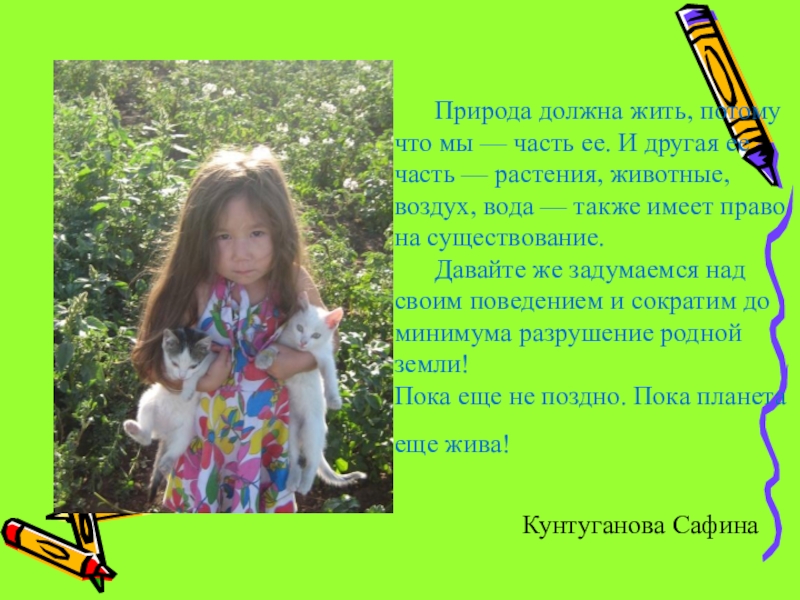 Слайд 8 Природа должна жить, потому что мы — часть ее. И другая