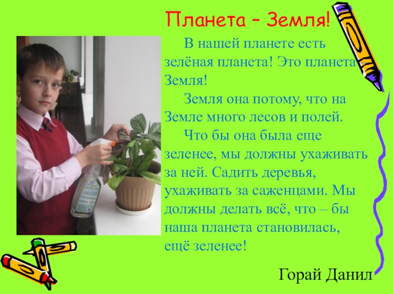 Что бы она была еще зеленее, мы должны ухаживать за ней. Садить деревья, ухаживать за саженцами. Мы должны делать всё, что – бы наша планета становилась, ещё зеленее!