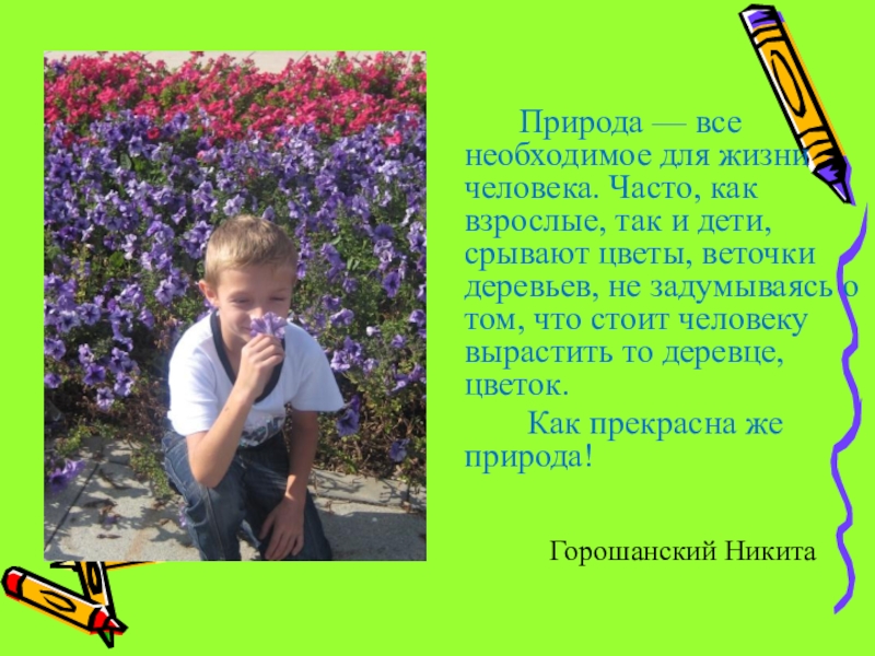 жизни человека. Часто, как взрослые, так и дети, срывают цветы, веточки деревьев, не задумываясь о том, что стоит человеку вырастить то деревце, цветок.