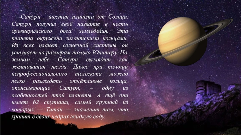 древнеримского бога земледелия. Эта планета окружена гигантскими кольцами. Из всех планет солнечной системы он уступает по размерам только Юпитеру. На земном небе Сатурн выглядит как желтоватая звезда. Даже при помощи непрофессионального телескопа можно легко разглядеть отчётливые кольца, опоясывающие Сатурн, – одну из особенностей этой планеты. А ещё она имеет 62 спутника, самый крупный из которых — Титан — знаменит тем, что хранит в своих недрах жидкую воду.
