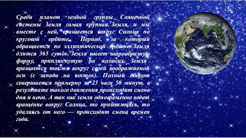 вместе с ней, вращается вокруг Солнца по круговой орбите,. Период, за который обращается по эллиптической орбите Земля длится 365 суток. Земля имеет шарообразную форму, приплюснутую на полюсах. Земля вращается также вокруг своей воображаемой оси (с запада на восток). Полный оборот совершается примерно за 23 часа 56 минут. в результате такого движения происходит смена дня и ночи. А так как земля одновременно ведет вращение вокруг Солнца, то приближаясь, то удаляясь от него — происходит смена времен года.