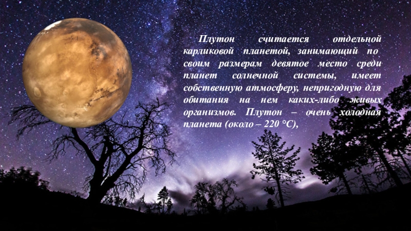 среди планет солнечной системы, имеет собственную атмосферу, непригодную для обитания на нем каких-либо живых организмов. Плутон – очень холодная планета (около – 220 °C),