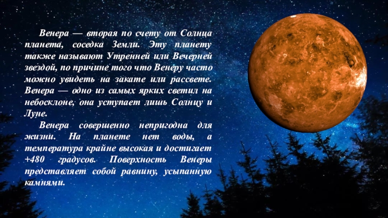 Слайд 6 Венера — вторая по счету от Солнца планета, соседка Земли. Эту