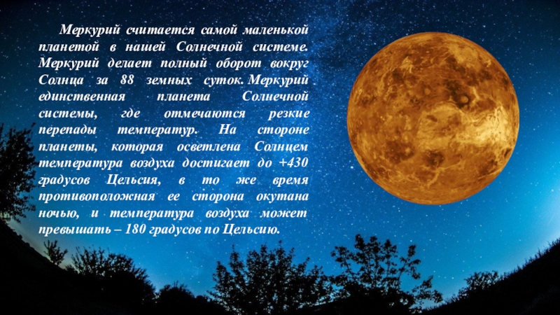 Слайд 5 Меркурий считается самой маленькой планетой в нашей Солнечной системе. Меркурий делает