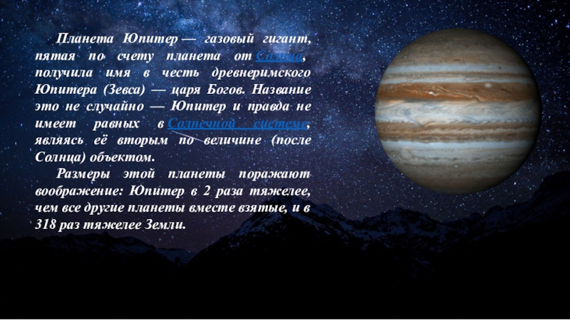 Слайд 11 Планета Юпитер — газовый гигант, пятая по счету планета от Солнца, получила имя