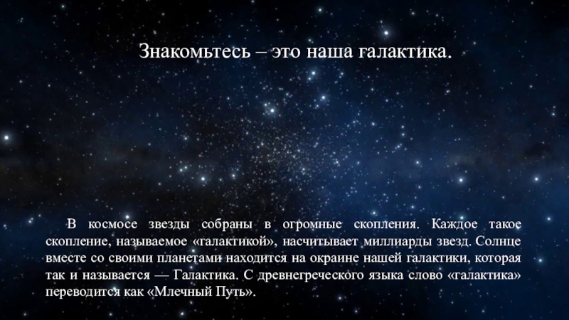 «галактикой», насчитывает миллиарды звезд. Солнце вместе со своими планетами находится на окраине нашей галактики, которая так и называется — Галактика. С древнегреческого языка слово «галактика» переводится как «Млечный Путь».
